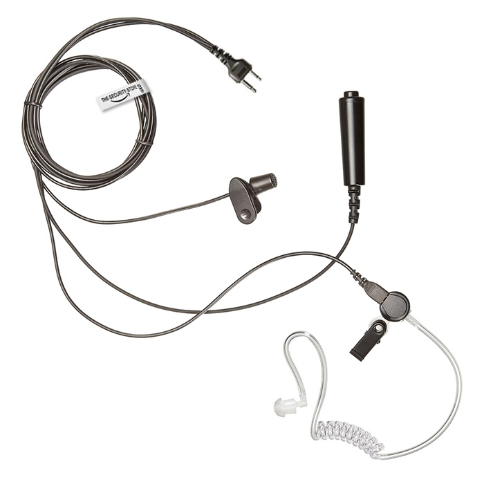 This Uniden 2 pin earpiece is professional 3 wire covert acoustic kit. This consists of a connector that plugs into the base of the radio terminal with 3 leads coming from it. The first wire goes to a discreet clear coiled tube earpiece which is difficult to see and easily hidden by hair and collar. The second wire goes to a small microphone with a clothing pin which is pinned to the shirt near the lapel. The third wire goes to a PTT / Microphone.